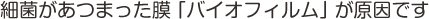 歯周病は「バイオフィルム」による感染症です。 バイオフィルムは複数の細菌がネバネバの多糖体を作って付着した粘膜のことです。バイオフィルムはお口の中だけでなく、身近にも存在しています。 例えば台所やお風呂場の排水口などの水周りのヌルヌルしたものもバイオフィルムです。これらは物理的に擦り落とすことで除去できますが、お口の中も一緒です。歯科では歯の表面についたバイオフィルムをプラーク(歯垢)と呼んでいます。